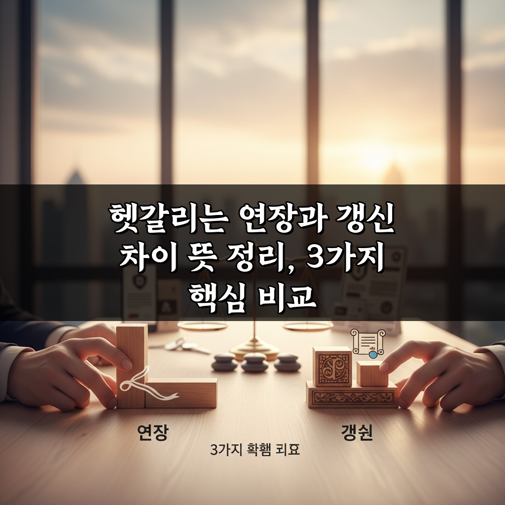 헷갈리는 연장과 갱신 차이, 이제 명확히 정리해 드립니다. 3가지 핵심 비교로 두 용어의 정확한 뜻은 물론, 실생활 적용까지 완벽하게 이해하고 혼동을 끝내세요! (95자)